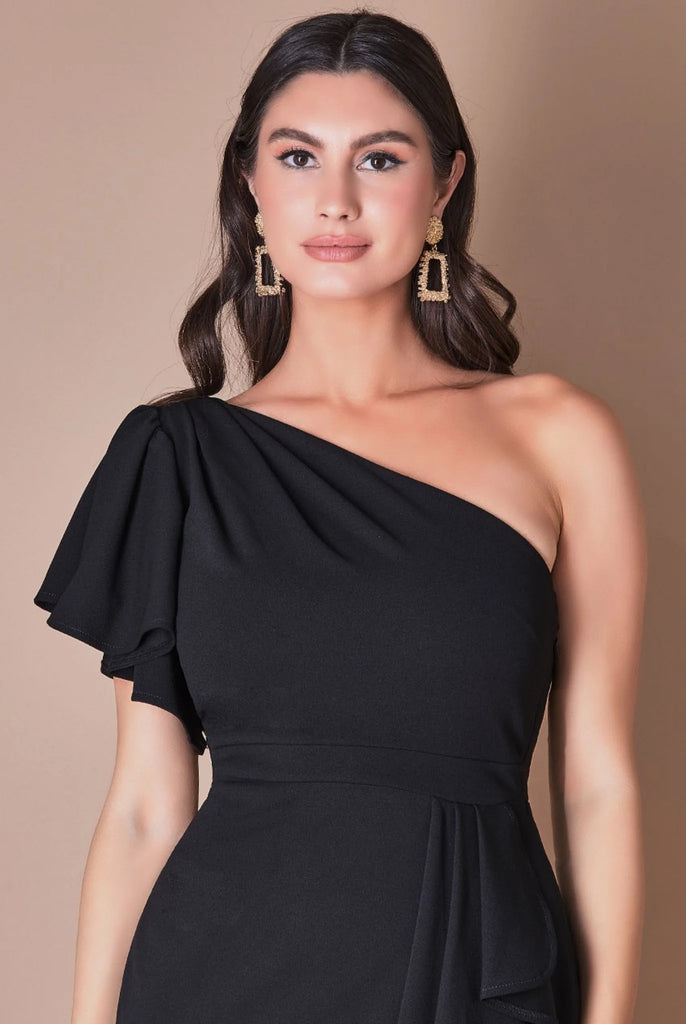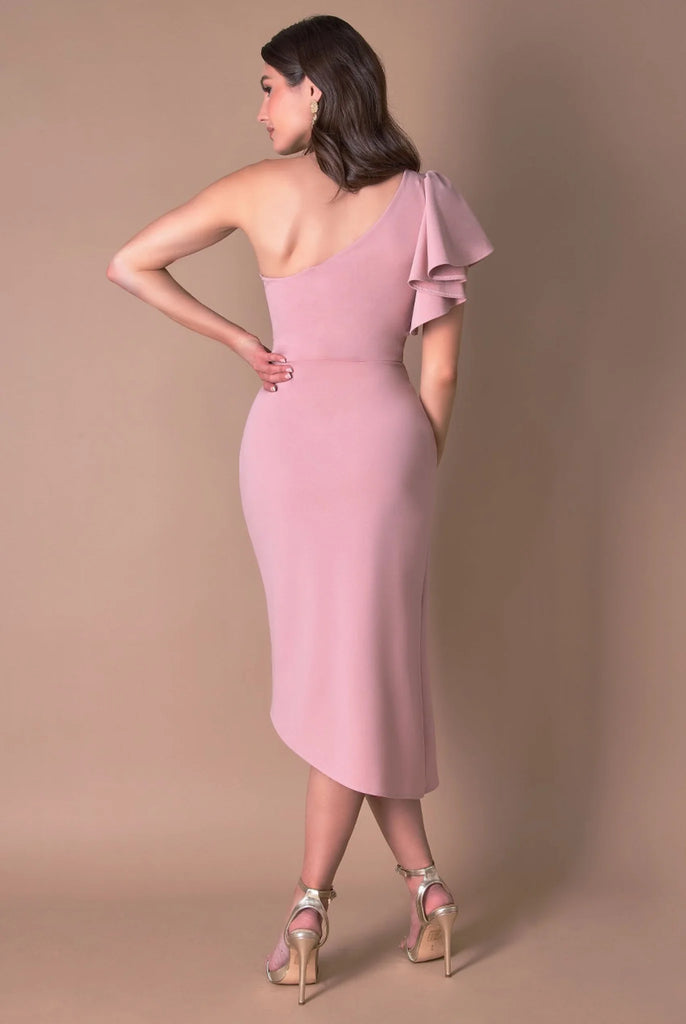 The Waterfall Sleeve Wrap Midi Dress is the perfect choice for anyone looking to make a statement this season. This bodycon dress features a flattering one shoulder design and is crafted from scuba crepe fabric for a comfortable and stretchy fit. With a midi length, this dress strikes the perfect balance between formal and stylish. The standout feature of this dress is the waterfall sleeve, which cascades down the shoulder for a unique and eye-catching touch. Whether you're attending a wedding or other special occasion, this little number is sure to turn heads